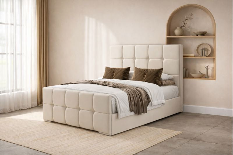 The Cubera Bed Frame is a bold, contemporary statement piece designed to transform any bedroom into a luxury retreat. Featuring a unique quilted cube pattern across both the headboard and footboard, this bed brings texture, depth, and modern sophistication to your space.